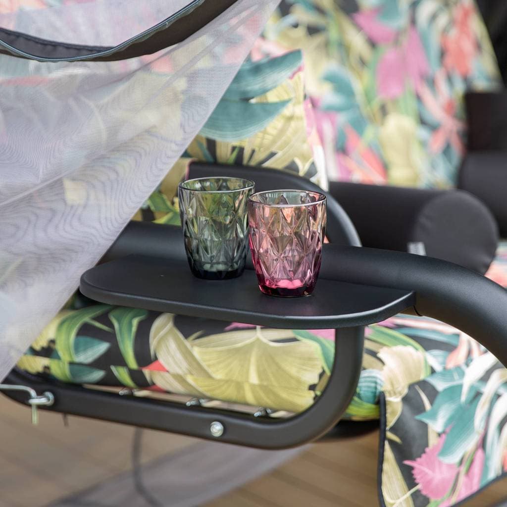 Качели могут раскладываться в положение лежа, собираются самостоятельно. По бокам предусмотрены столики — удобно поставить кружку или книгу. Все размеры и характеристики указаны в таблице ниже. Условия доставки и наличие уточняйте у менеджера.