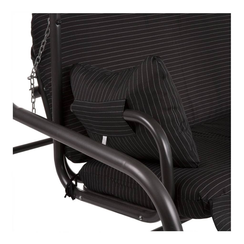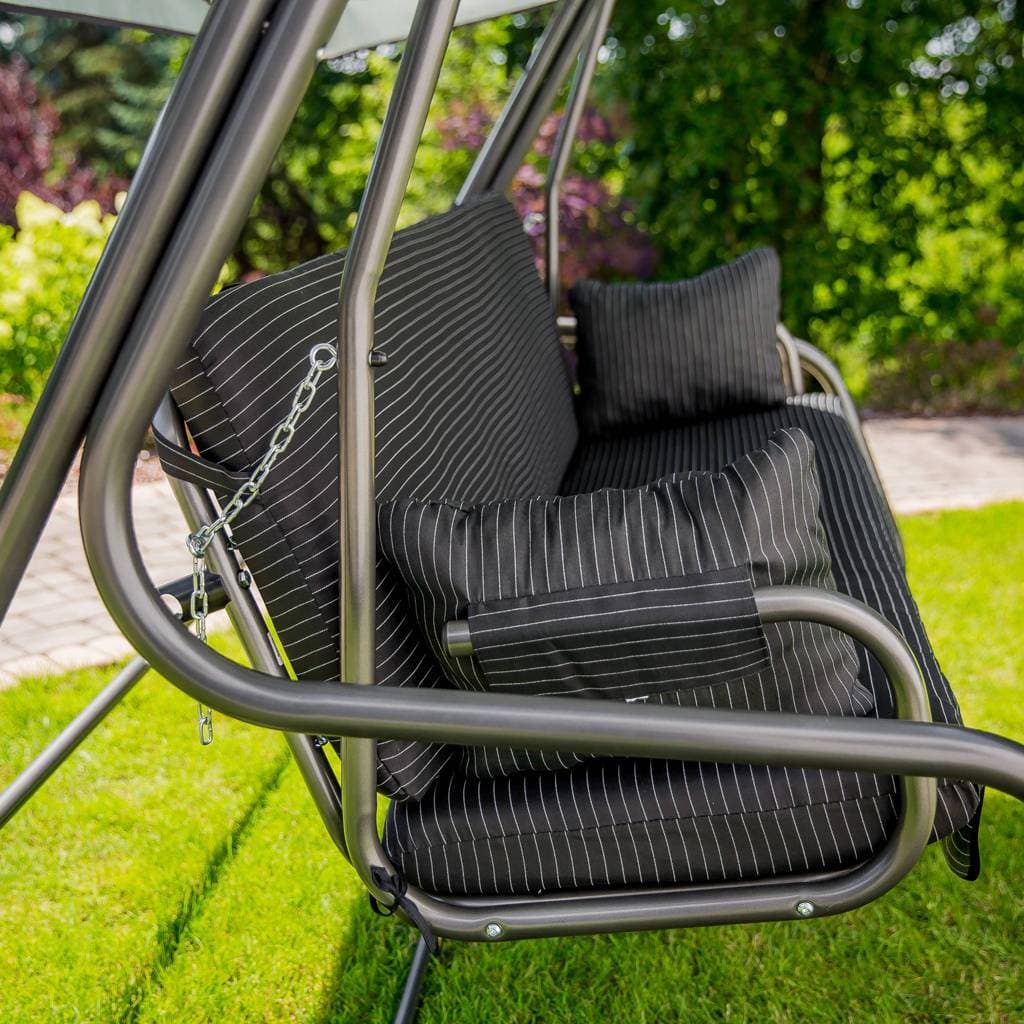 Сиденье установлено на пружинах — это позволяет качелям раскладываться в удобное спальное место. Размер сиденья: 170 см × 50 см. Высота спинки: 55 см. В комплекте подушки 170 см × 49 см, толщина 10 см, наполнитель — пенополиуретан.