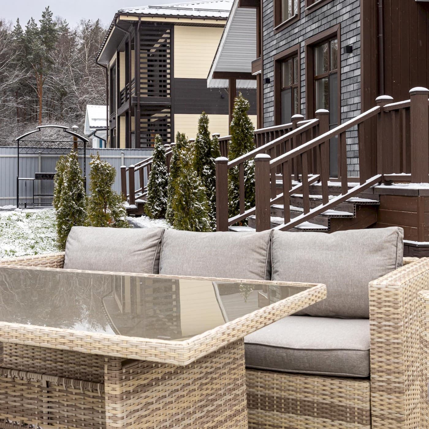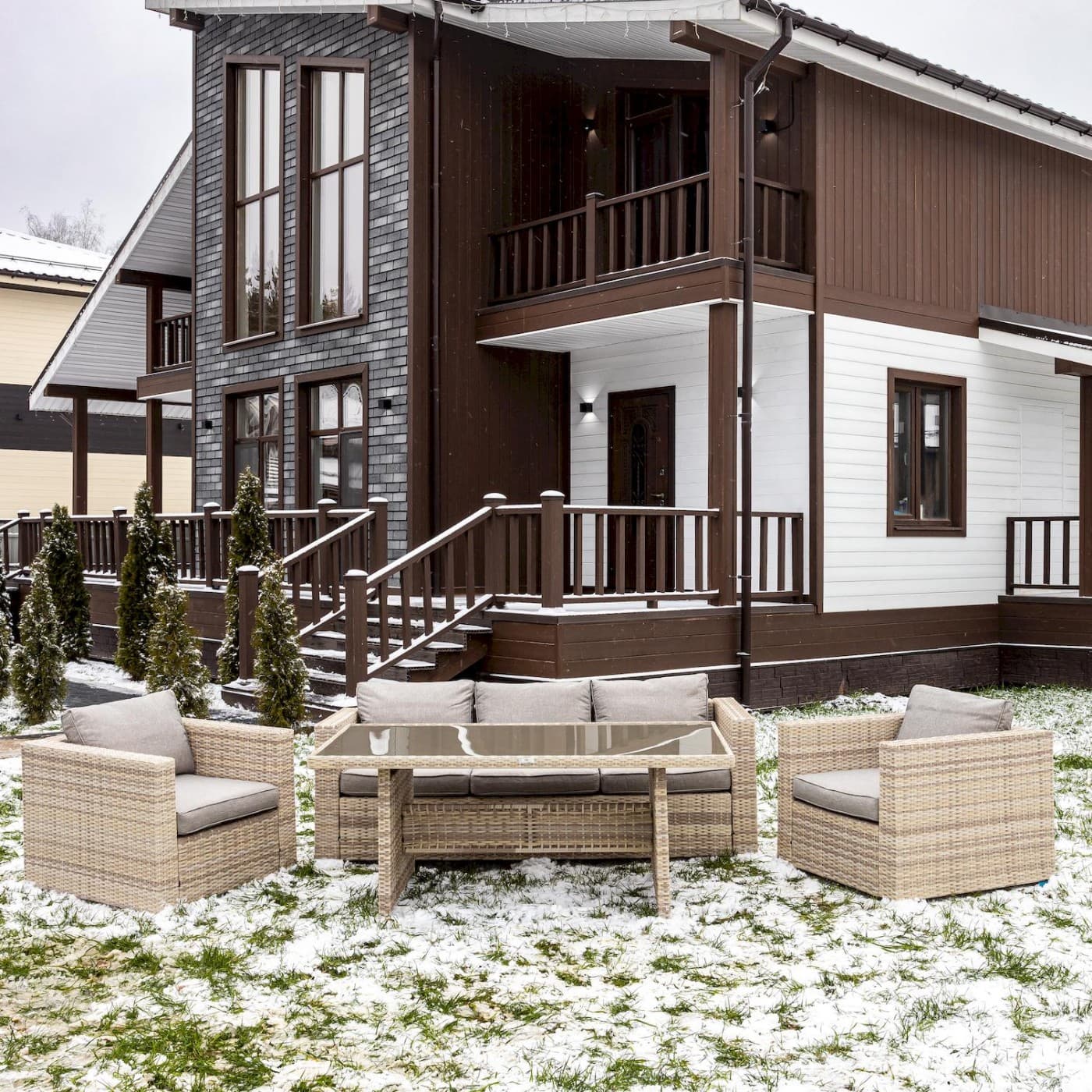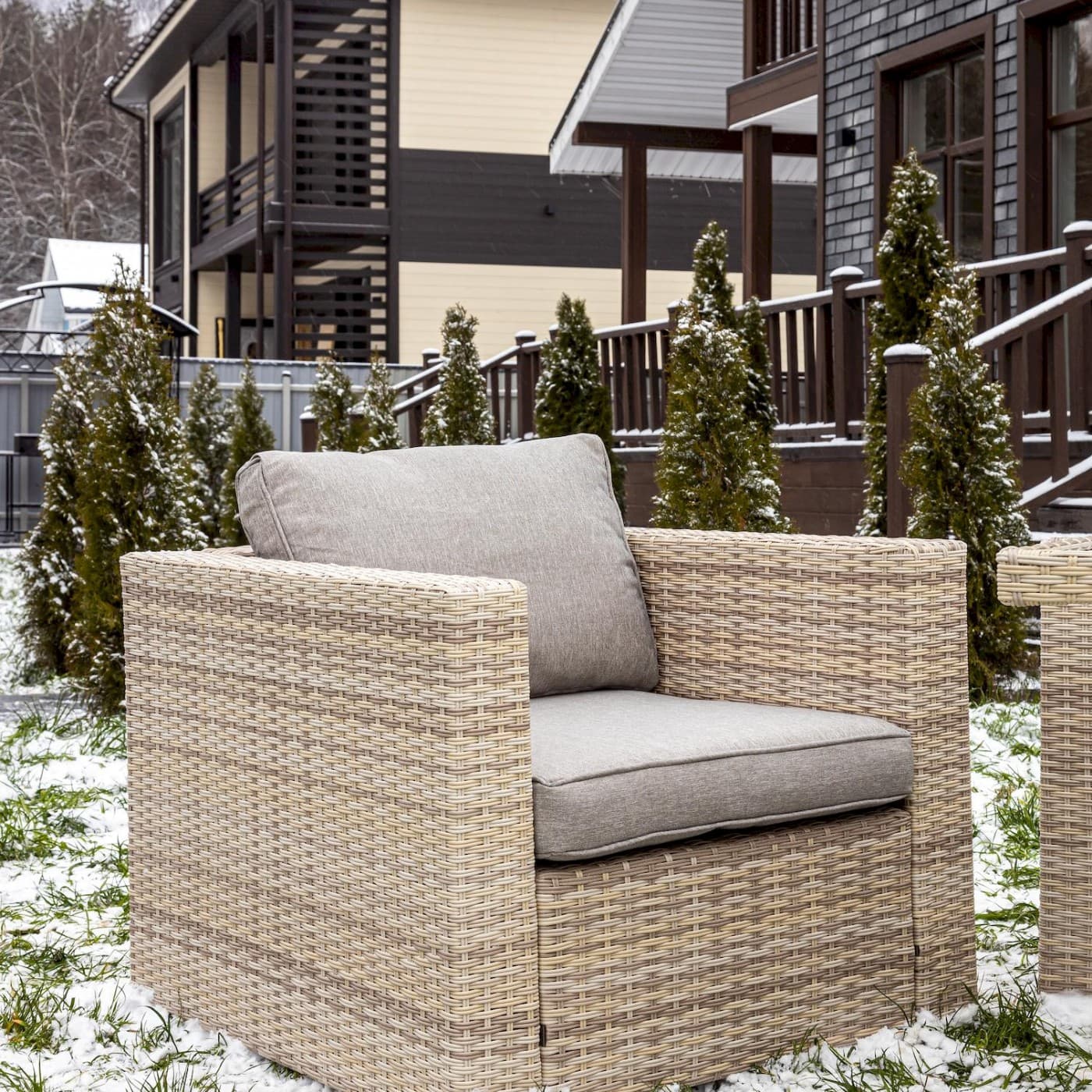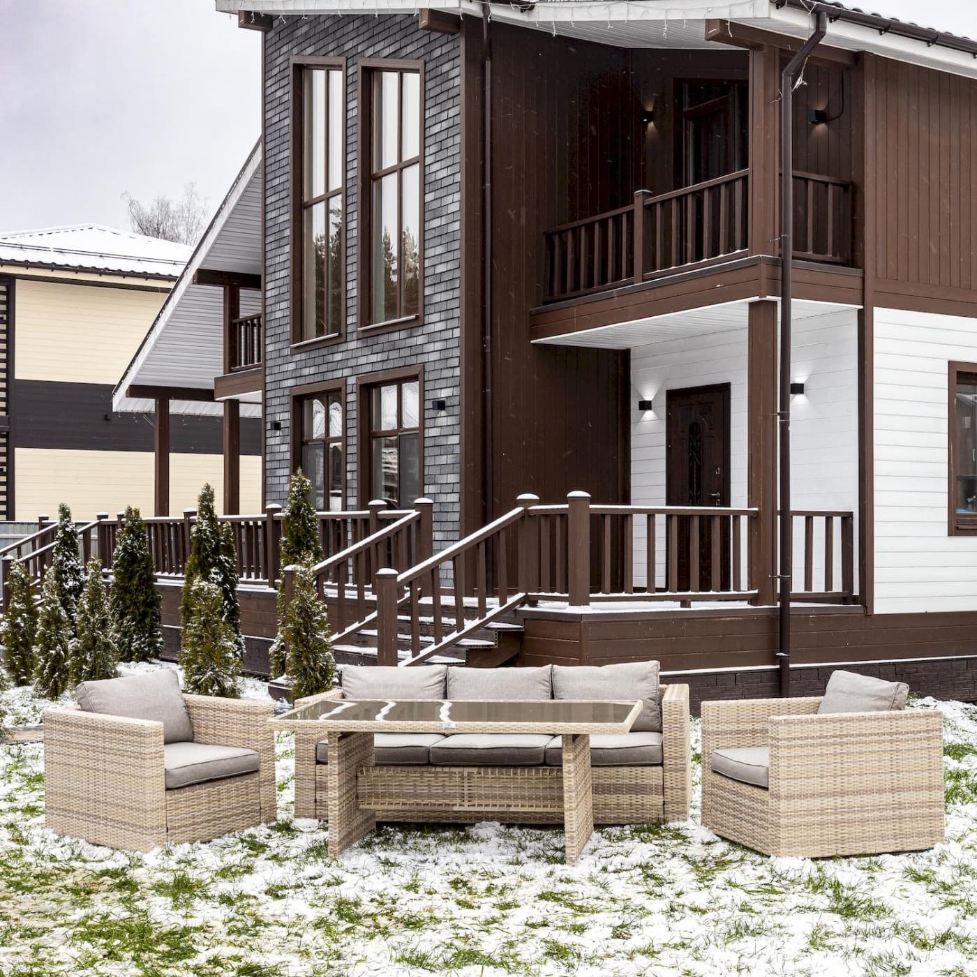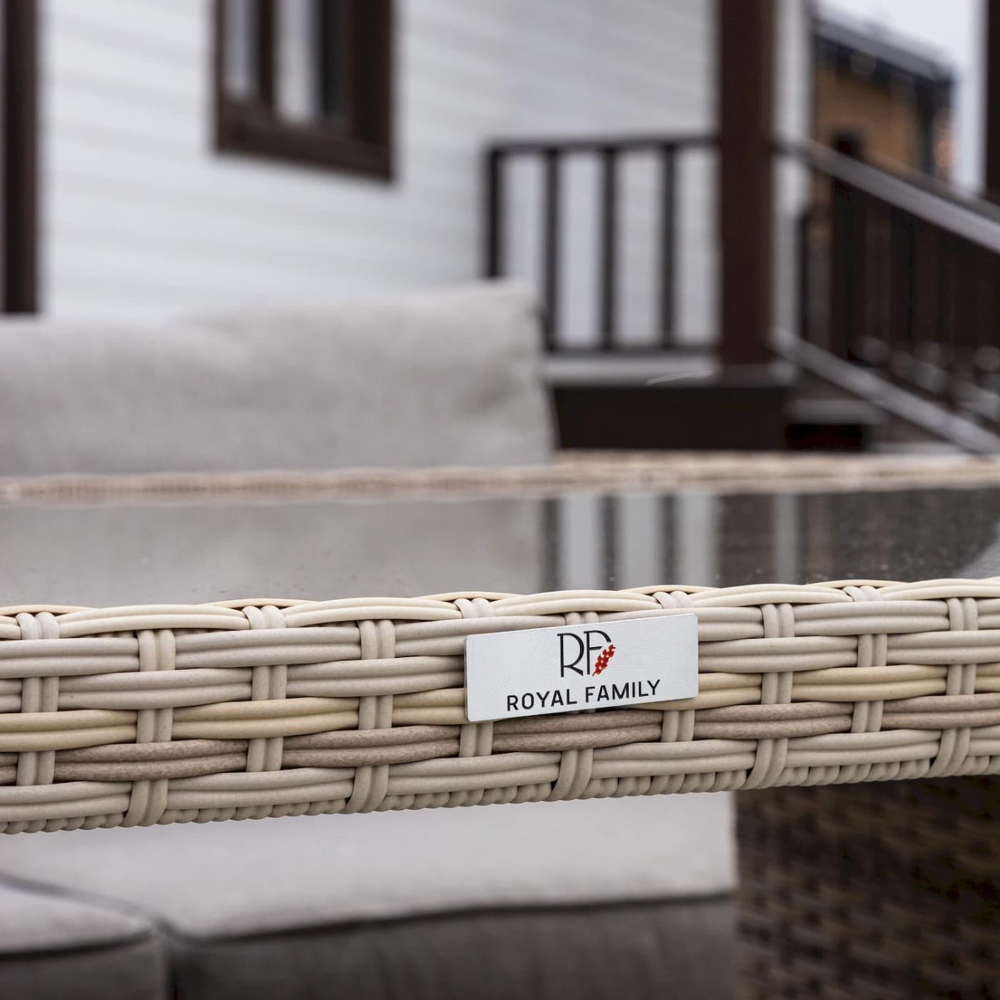 Все элементы мебели изготовлены из качественных материалов: металлокаркас и искусственный ротанг. Ротанг — это прочный и легкий материал, который не требует особого ухода и отлично переносит воздействие внешней среды. Металлокаркас обеспечивает прочность и стабильность всего конструкта.