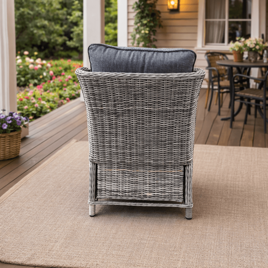 Серый ротанг с текстурой «сфера» создаёт эффект объёмного, живого полотна. Это не просто плетение — это ручная работа, которая придаёт креслу характер. Материал не выцветает, не расслаивается, не боится дождя и снега. Он просто остаётся красивым всегда.