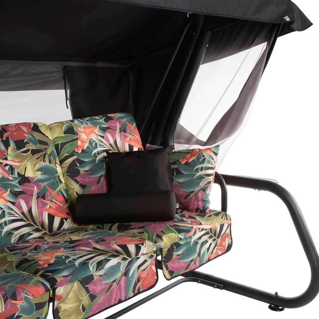 Стальная рама с порошковым покрытием устойчива к влаге, солнцу и перепадам температуры — качели подходят для круглогодичной эксплуатации на улице. Максимальная нагрузка — 400 кг. Габариты: 221 см × 143 см × 173 см. Вес изделия — 69 кг. Цвет каркаса: матовый чёрный.