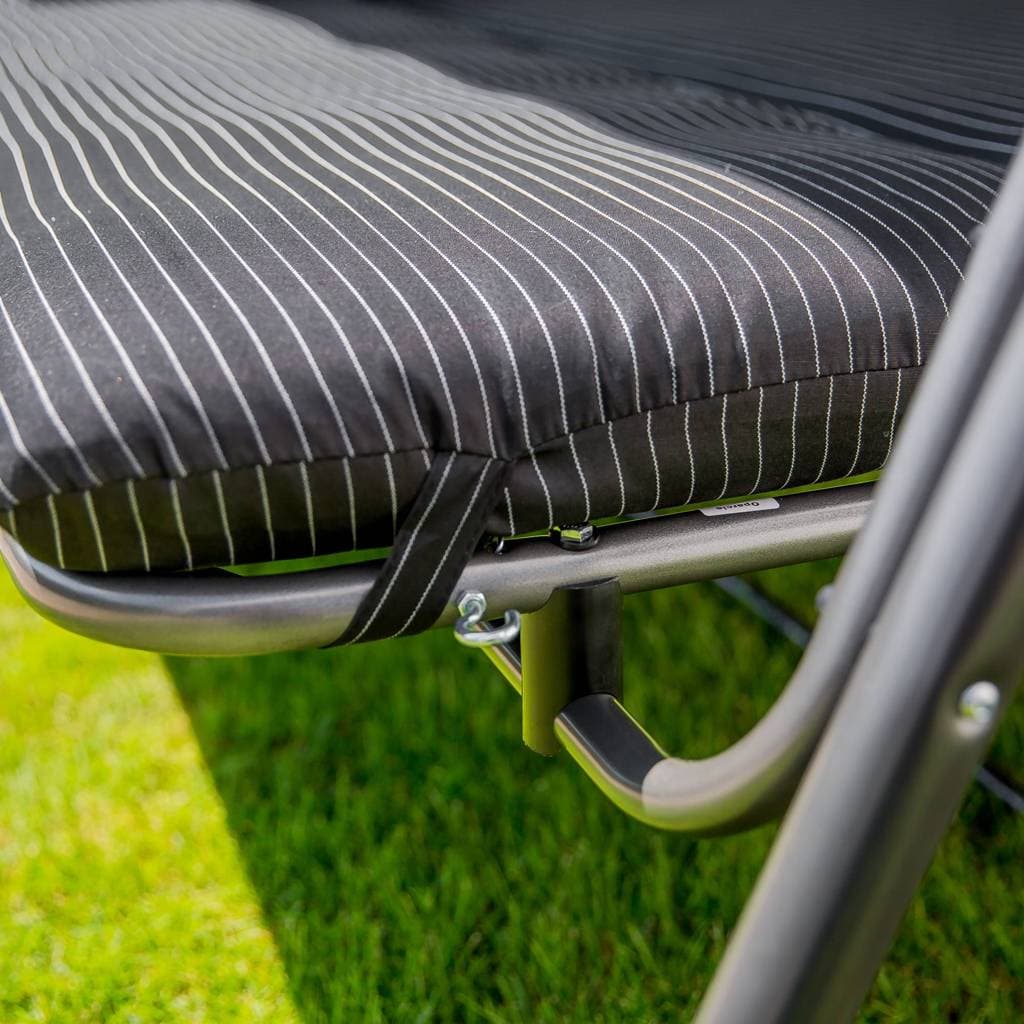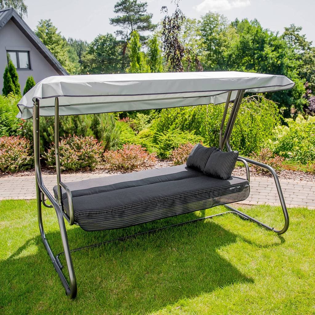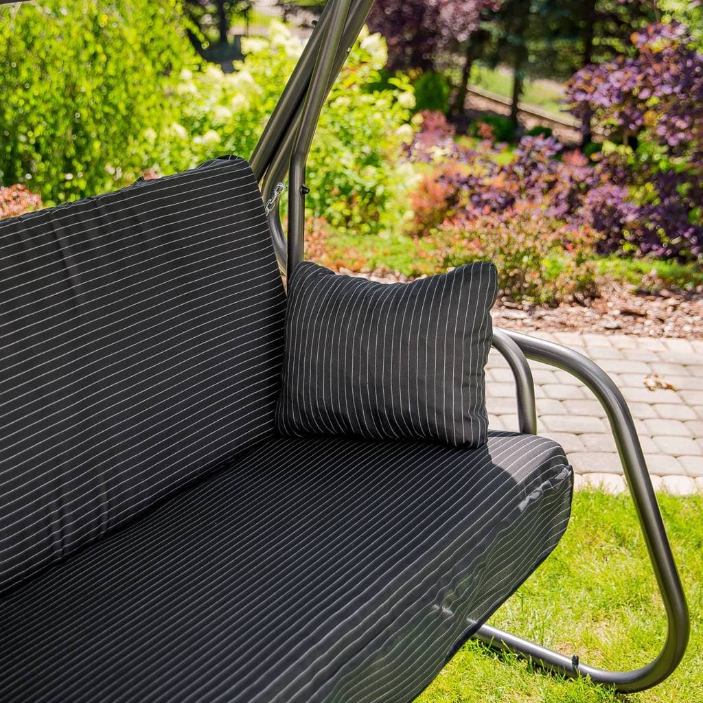 Сиденье установлено на пружинах — это позволяет качелям раскладываться в удобное спальное место. Размер сиденья: 170 см × 50 см. Высота спинки: 55 см. В комплекте подушки 170 см × 49 см, толщина 10 см, наполнитель — пенополиуретан.