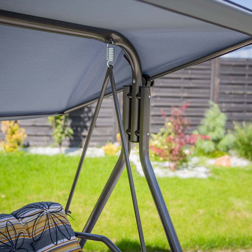 Стальная рама с порошковым покрытием устойчива к влаге, солнцу и перепадам температуры — качели подходят для круглогодичной эксплуатации на улице. Максимальная нагрузка — 300 кг. Габариты: 222 см × 126 см × 155 см. Вес изделия — 32.5 кг. Цвет каркаса: антрацит.