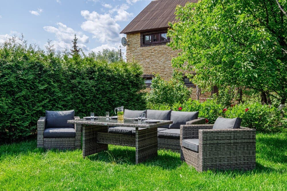 Все элементы мебели изготовлены из качественных материалов: металлокаркас и искусственный ротанг. Ротанг — это прочный и легкий материал, который не требует особого ухода и отлично переносит воздействие внешней среды. Металлокаркас обеспечивает прочность и стабильность всего конструкта.