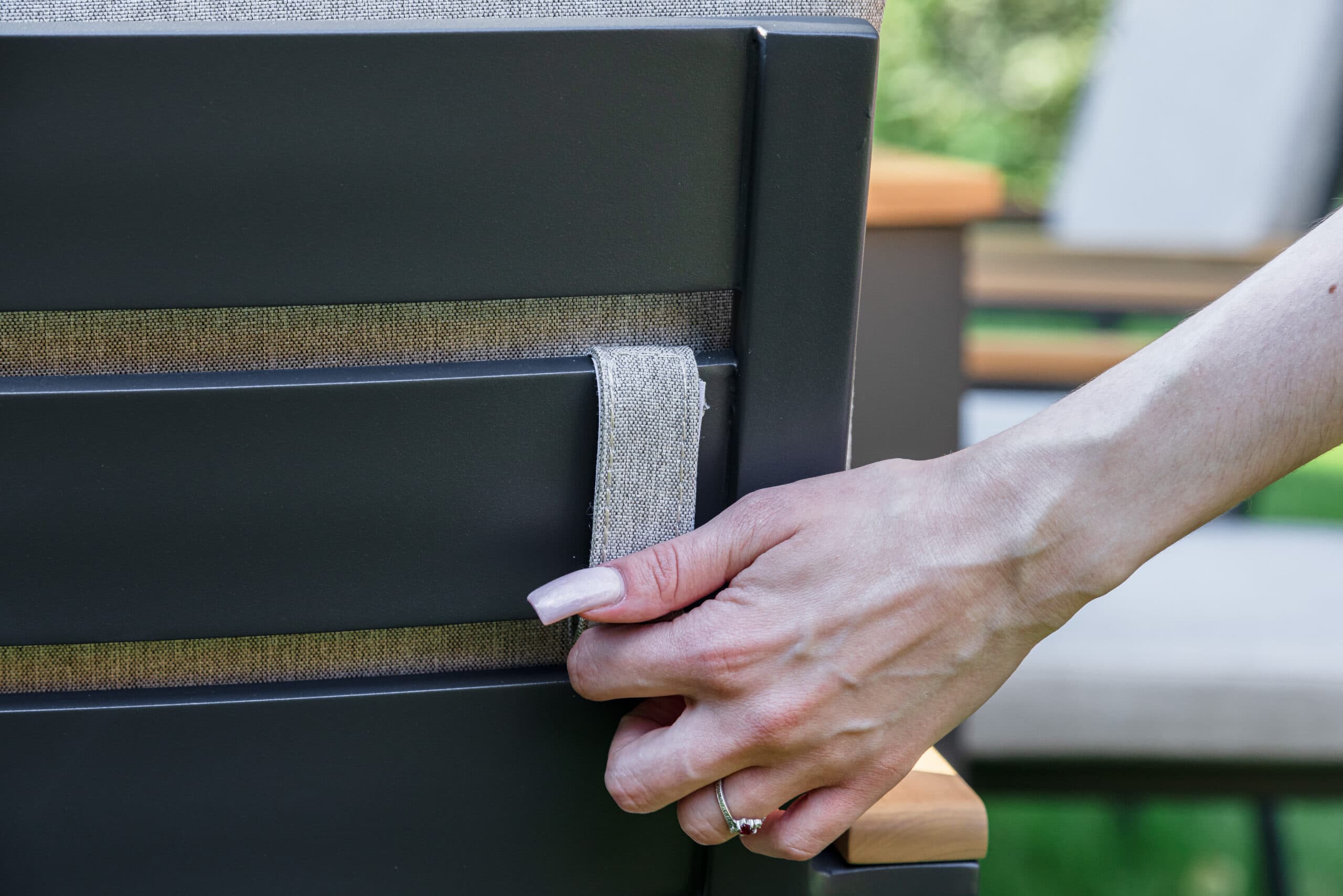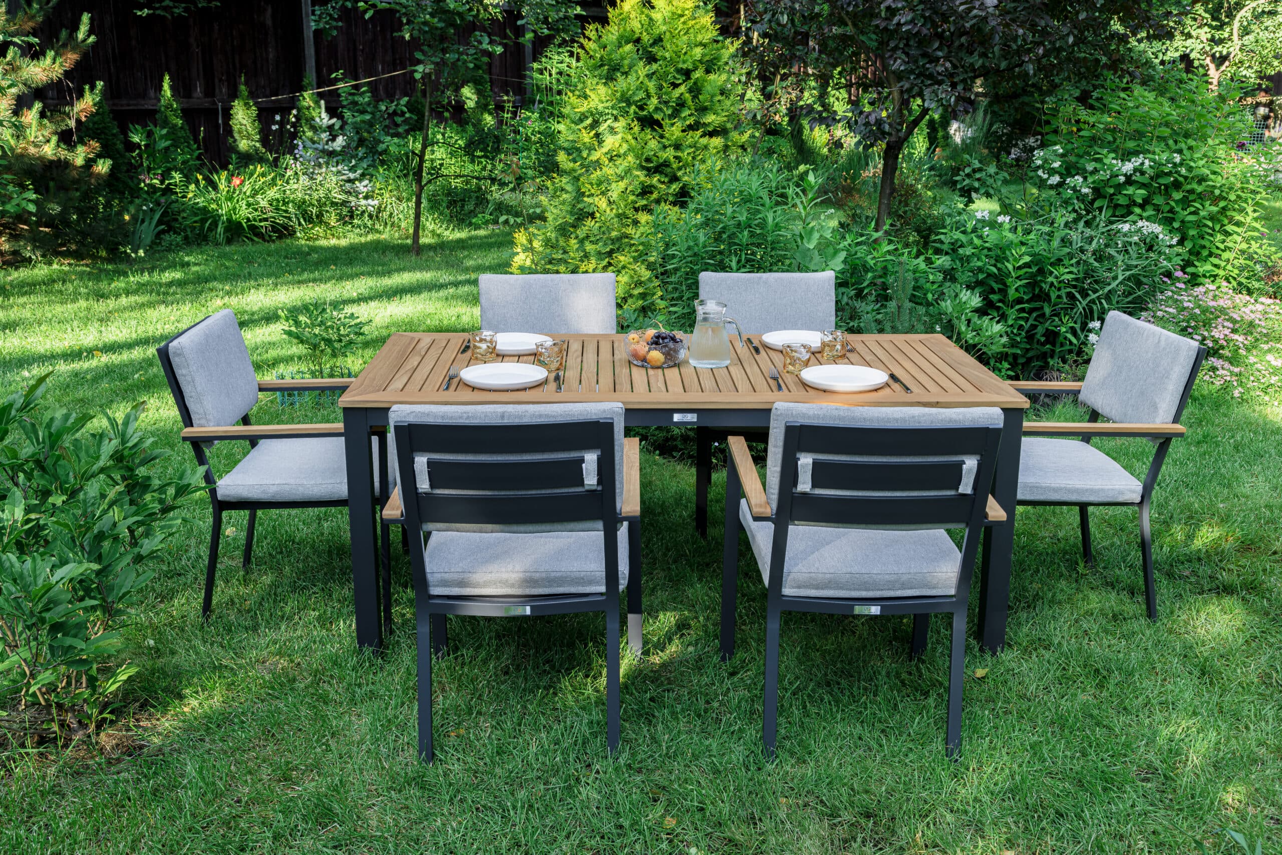 Столешница и подлокотники: Столешница выполнена из тика, что придает обеденному столу натуральный и изысканный вид. Тик также известен своей высокой стойкостью к влаге и ультрафиолетовому излучению, делая его идеальным для использования на открытом воздухе. Подлокотники кресел также выполнены из тика.