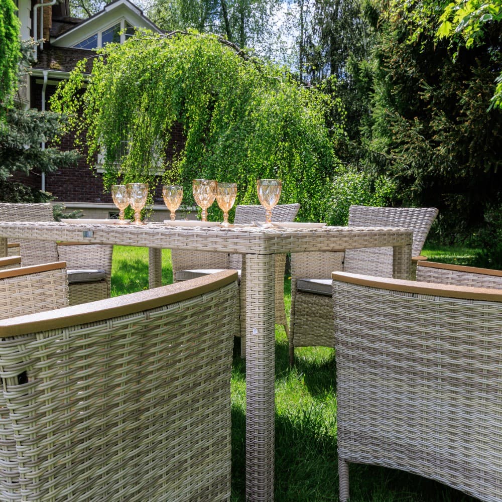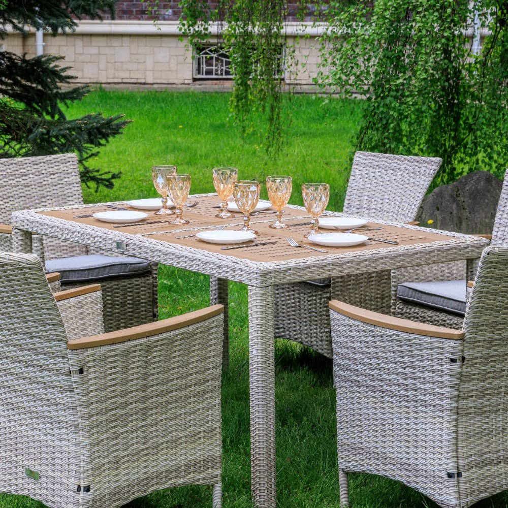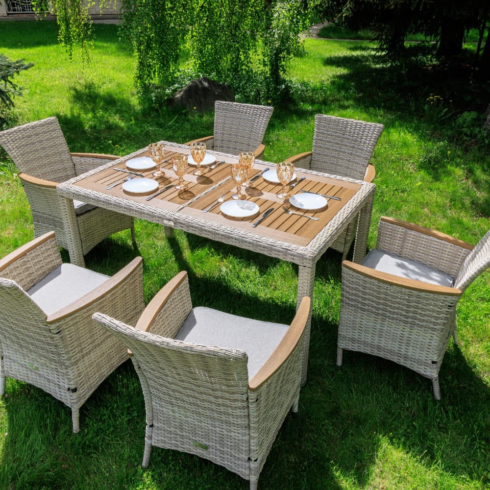 Включает в себя шесть кресел из искусственного ротанга на стальном каркасе и прочный стол.