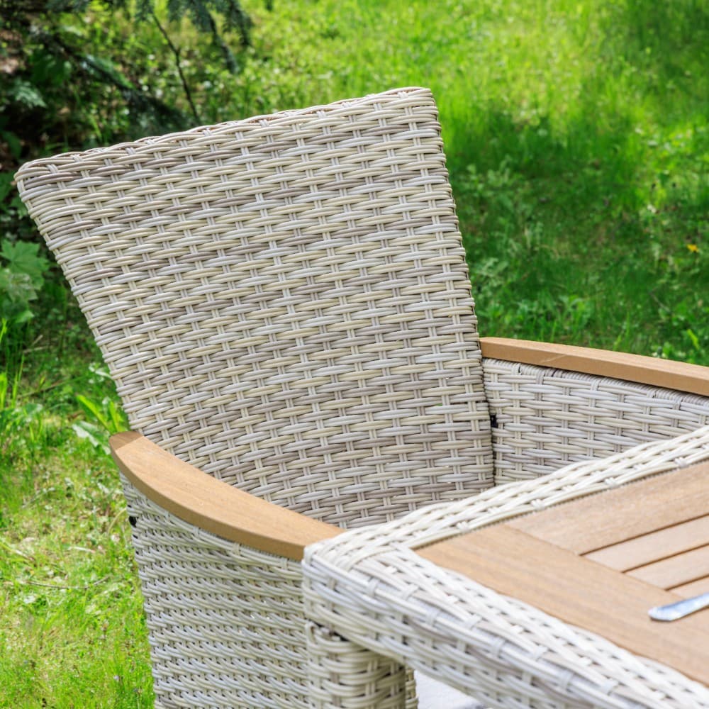Каждое кресло оснащено поливудом(искусственное дерево) на подлокотниках, столешница выполнена из того же материала, что придает изысканный вид и обеспечивает дополнительный комфорт.