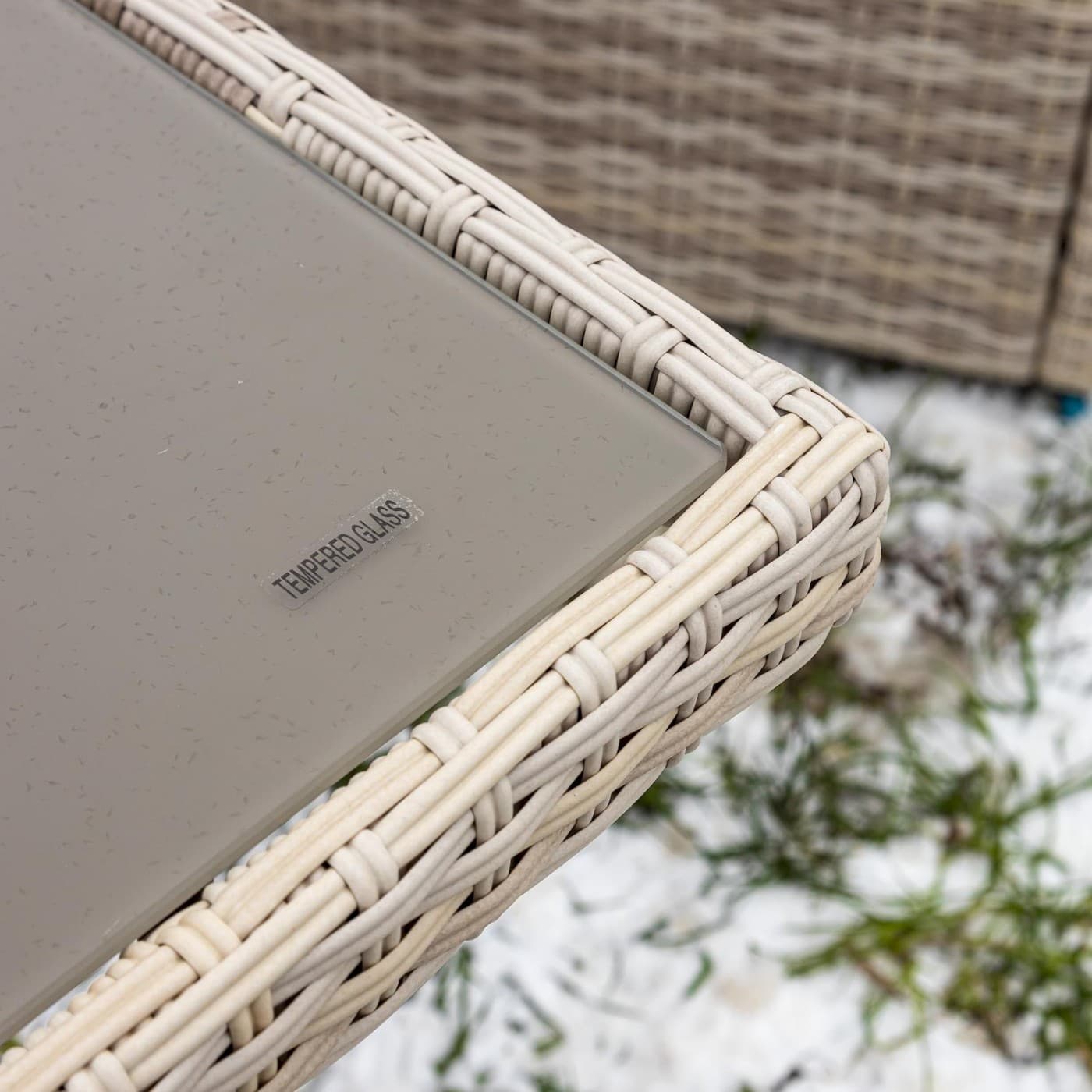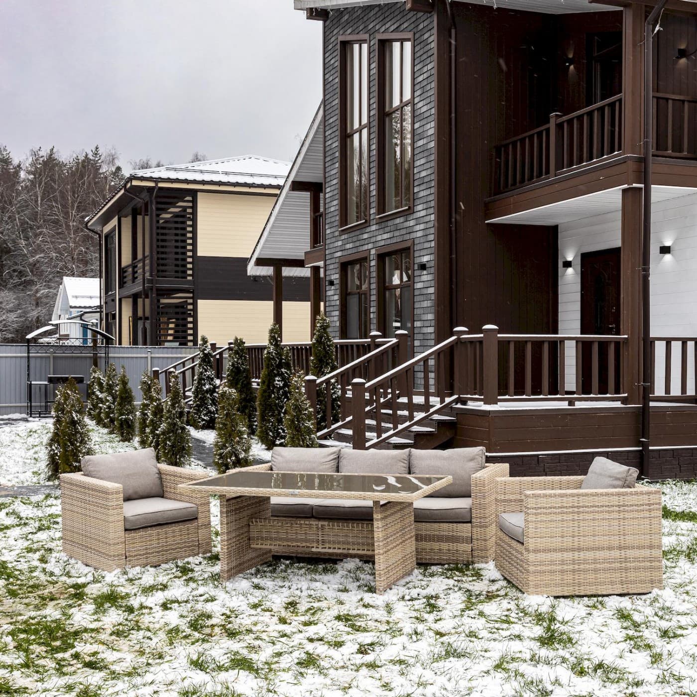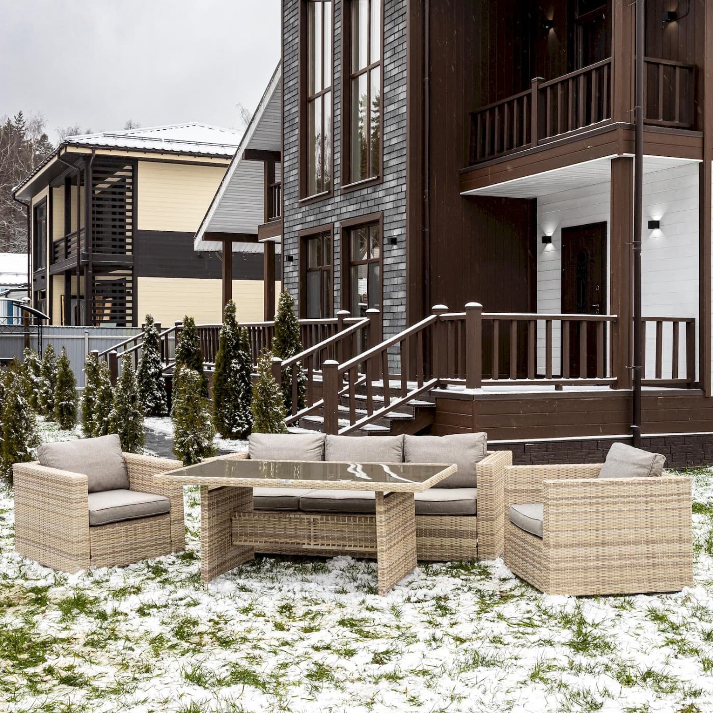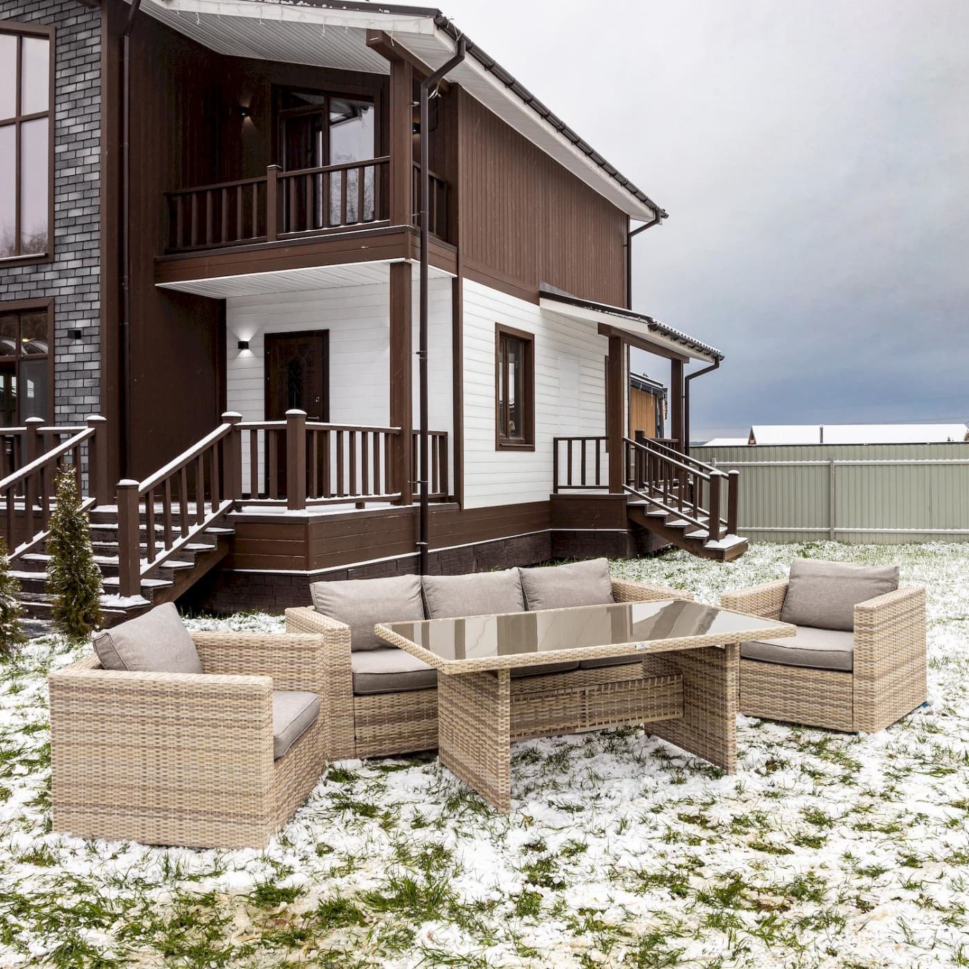 Все элементы мебели изготовлены из качественных материалов: металлокаркас и искусственный ротанг. Ротанг — это прочный и легкий материал, который не требует особого ухода и отлично переносит воздействие внешней среды. Металлокаркас обеспечивает прочность и стабильность всего конструкта.