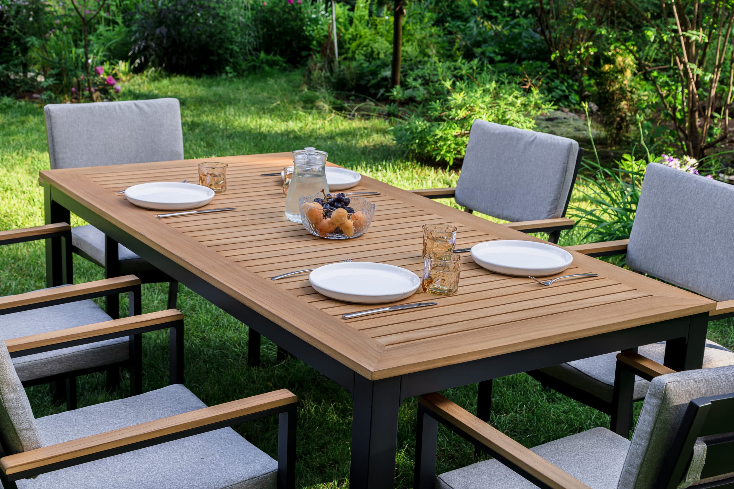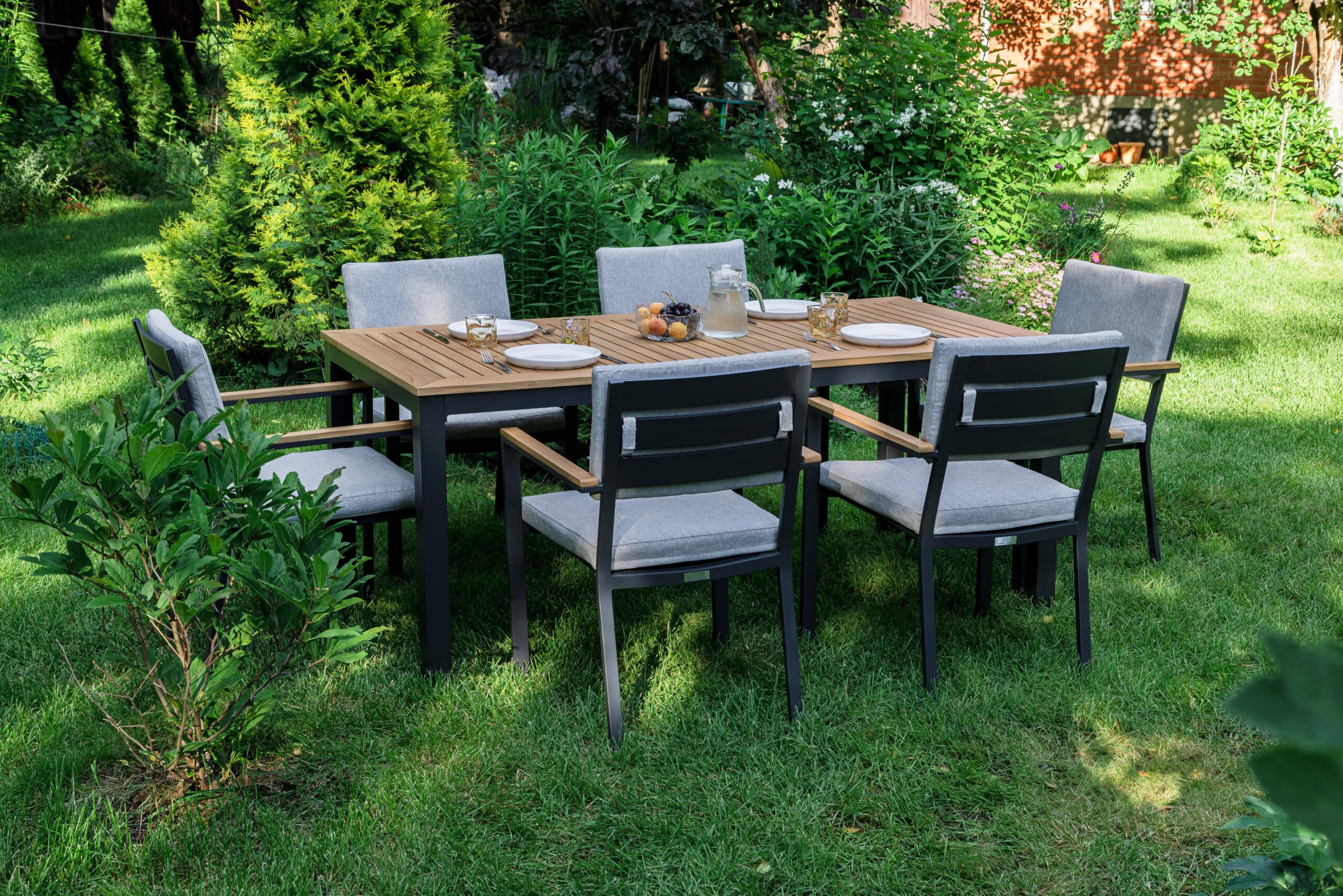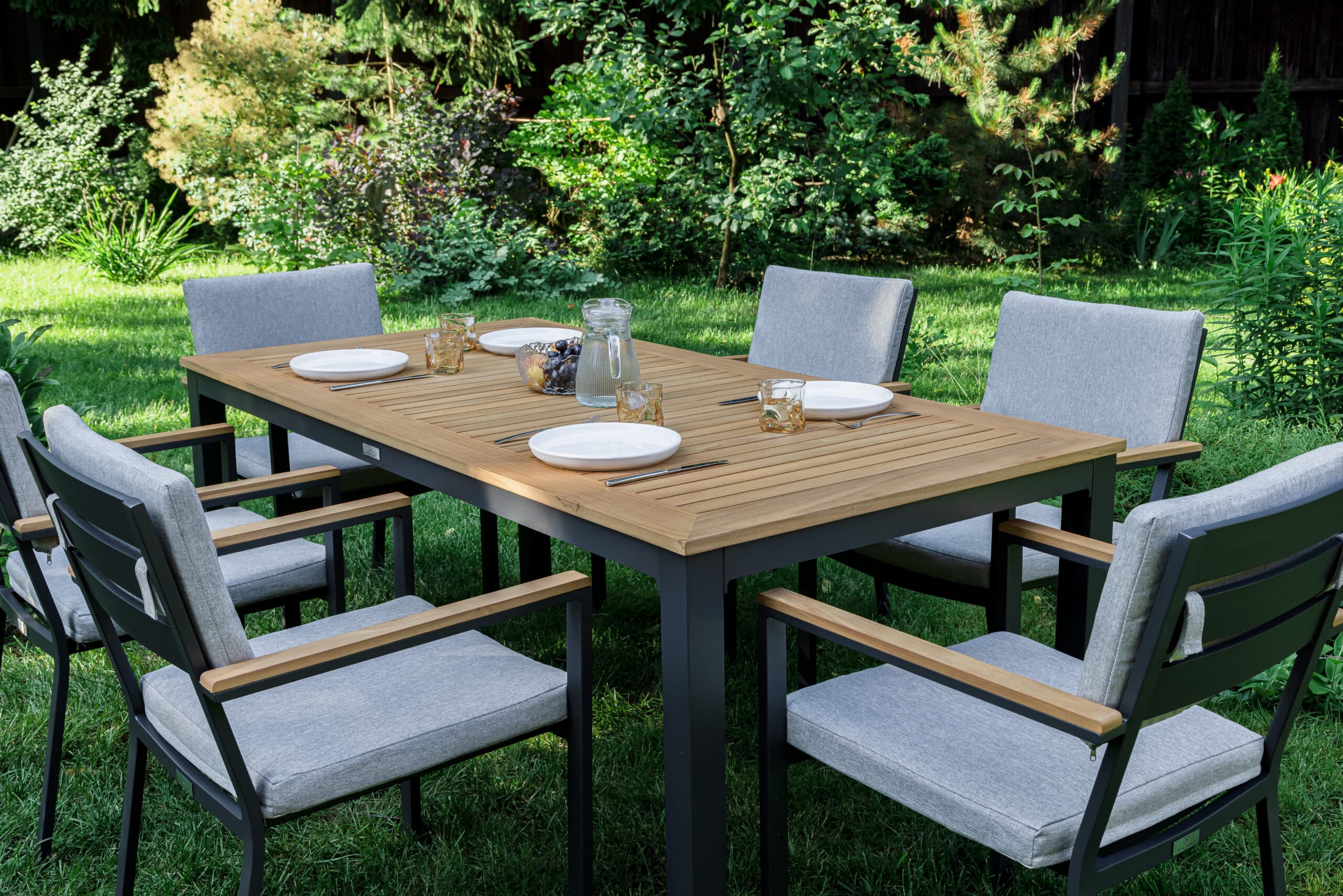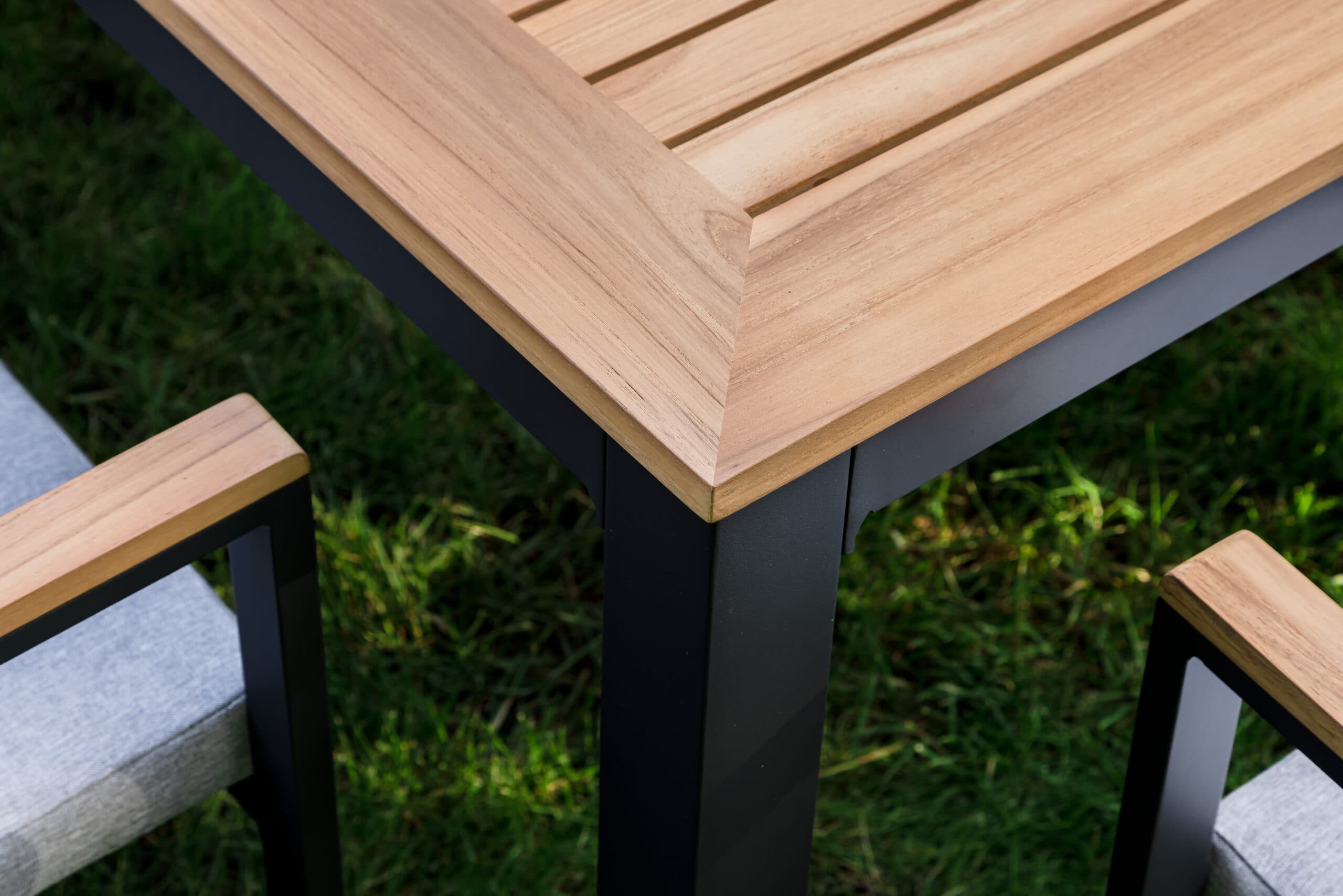 Столешница и подлокотники: Столешница выполнена из тика, что придает обеденному столу натуральный и изысканный вид. Тик также известен своей высокой стойкостью к влаге и ультрафиолетовому излучению, делая его идеальным для использования на открытом воздухе. Подлокотники кресел также выполнены из тика.