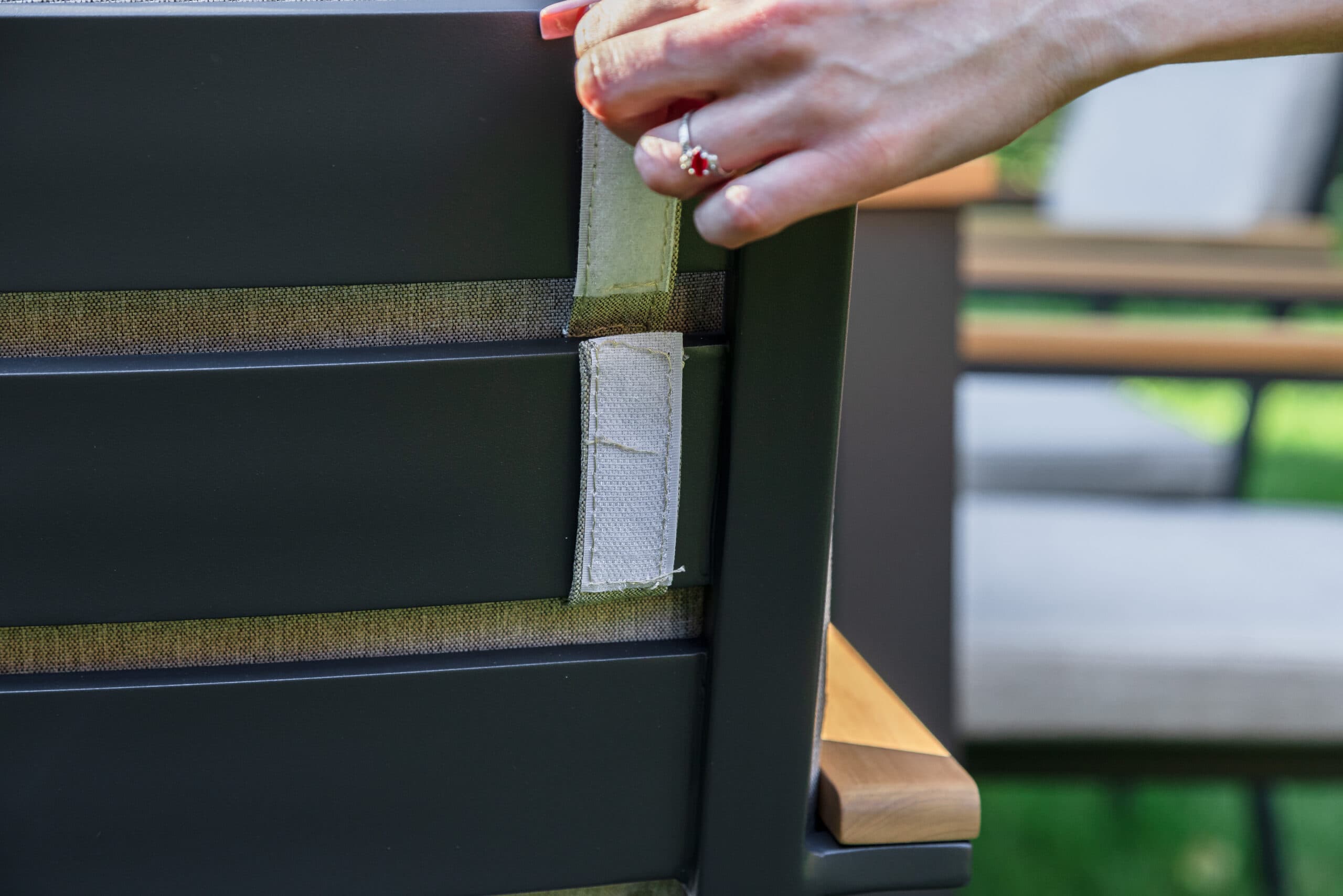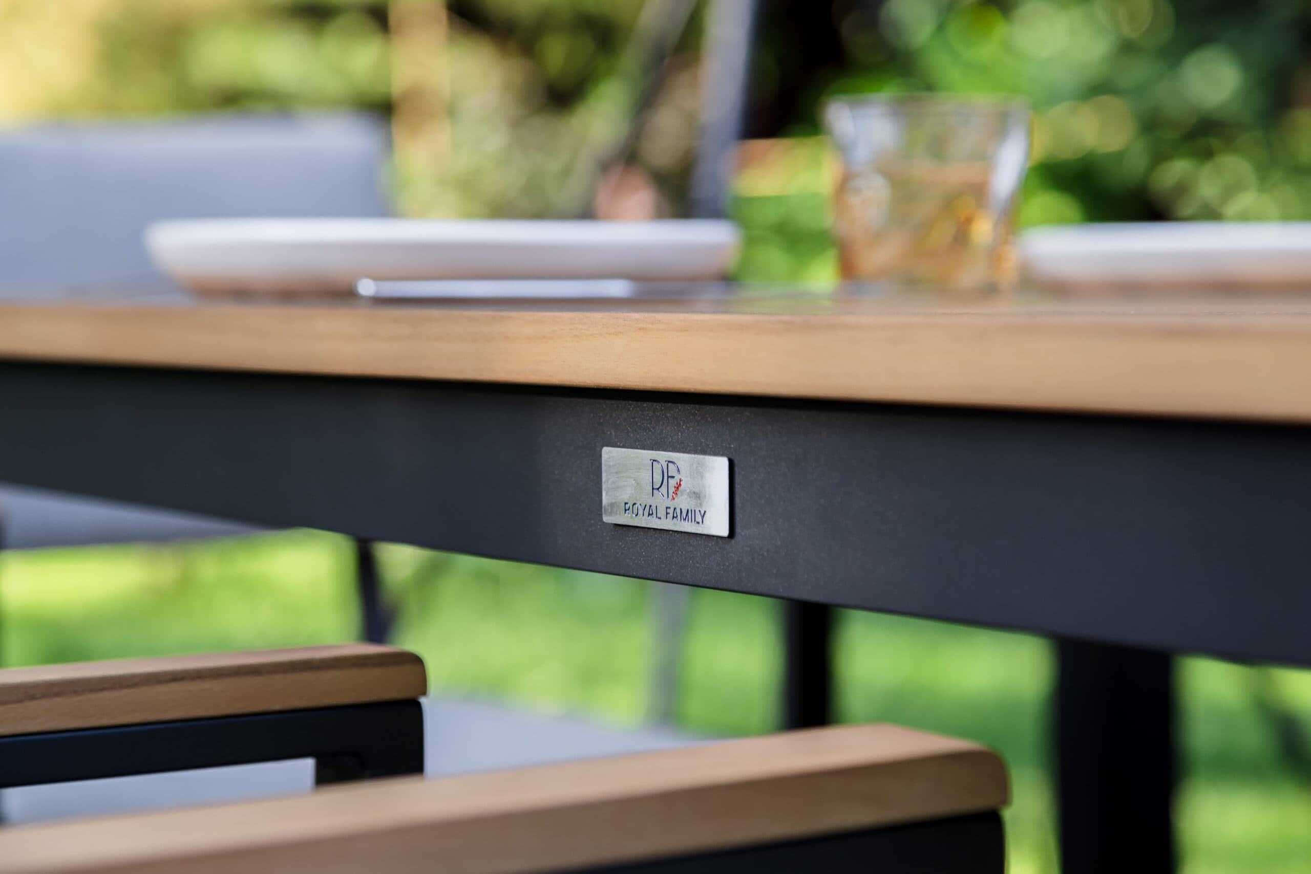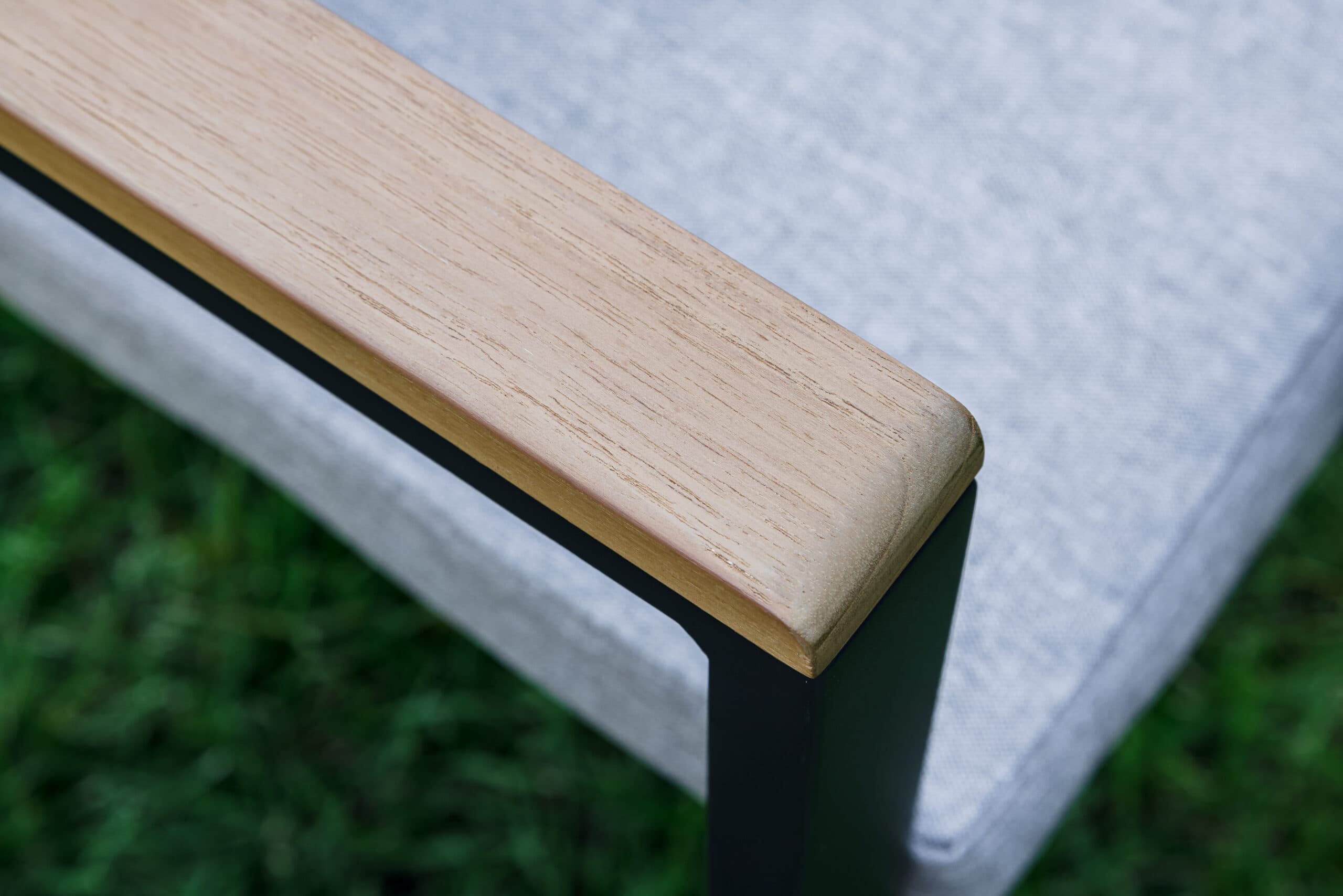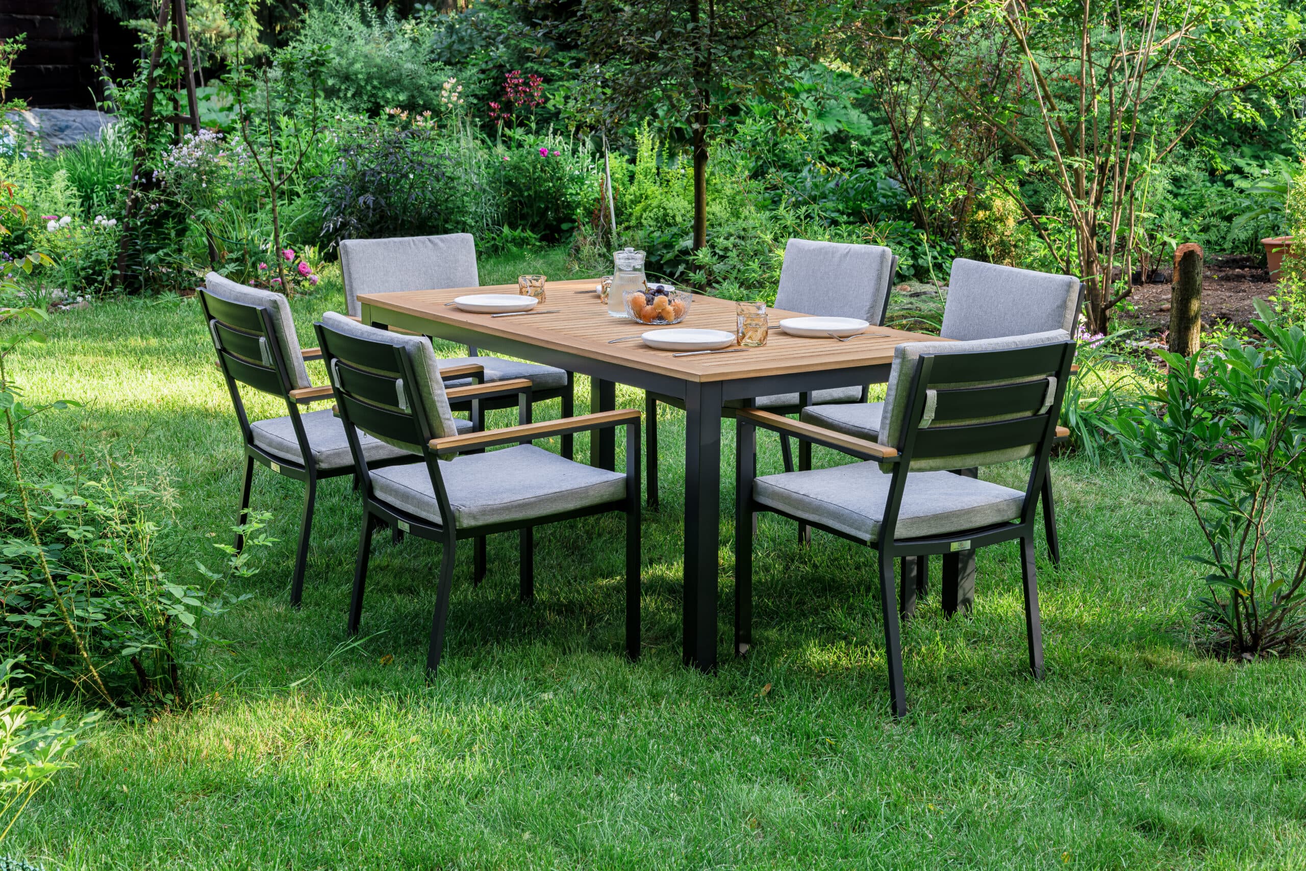 Столешница и подлокотники: Столешница выполнена из тика, что придает обеденному столу натуральный и изысканный вид. Тик также известен своей высокой стойкостью к влаге и ультрафиолетовому излучению, делая его идеальным для использования на открытом воздухе. Подлокотники кресел также выполнены из тика.