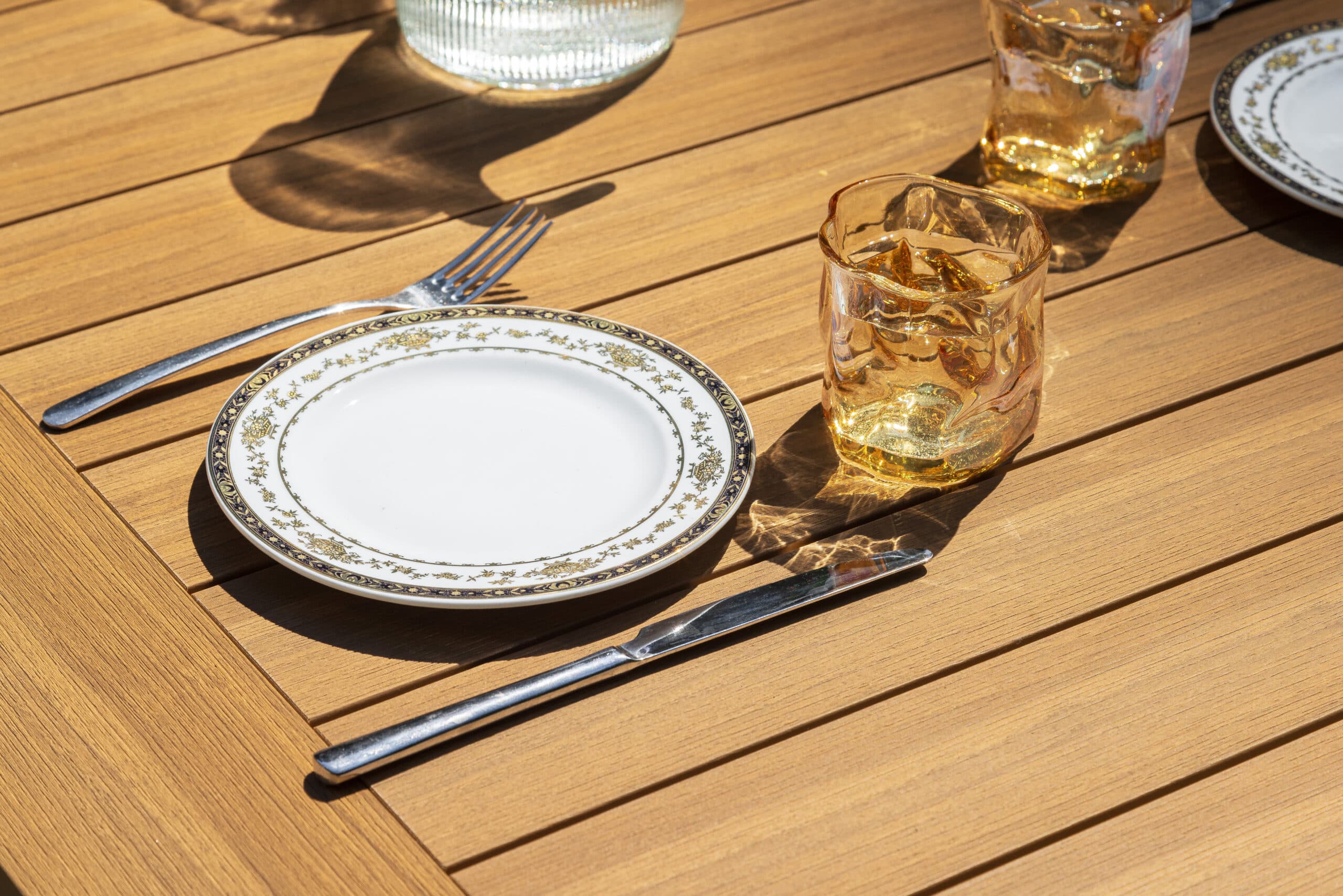 Столешница и подлокотники: Один из важнейших элементов этого комплекта — столешница из поливуда. Поливуд — это современный материал, который сочетает в себе натуральную древесину и прочность искусственных материалов. Это обеспечивает исключительную прочность и устойчивость к погодным условиям, при этом сохраняя красивый вид.