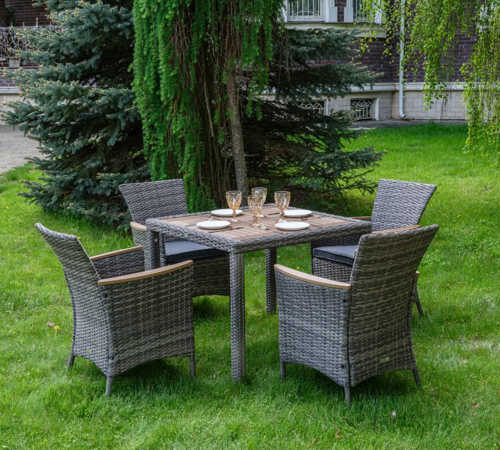 Включает в себя четыре кресла из искусственного ротанга на прочном стальном каркасе и прочный стол.