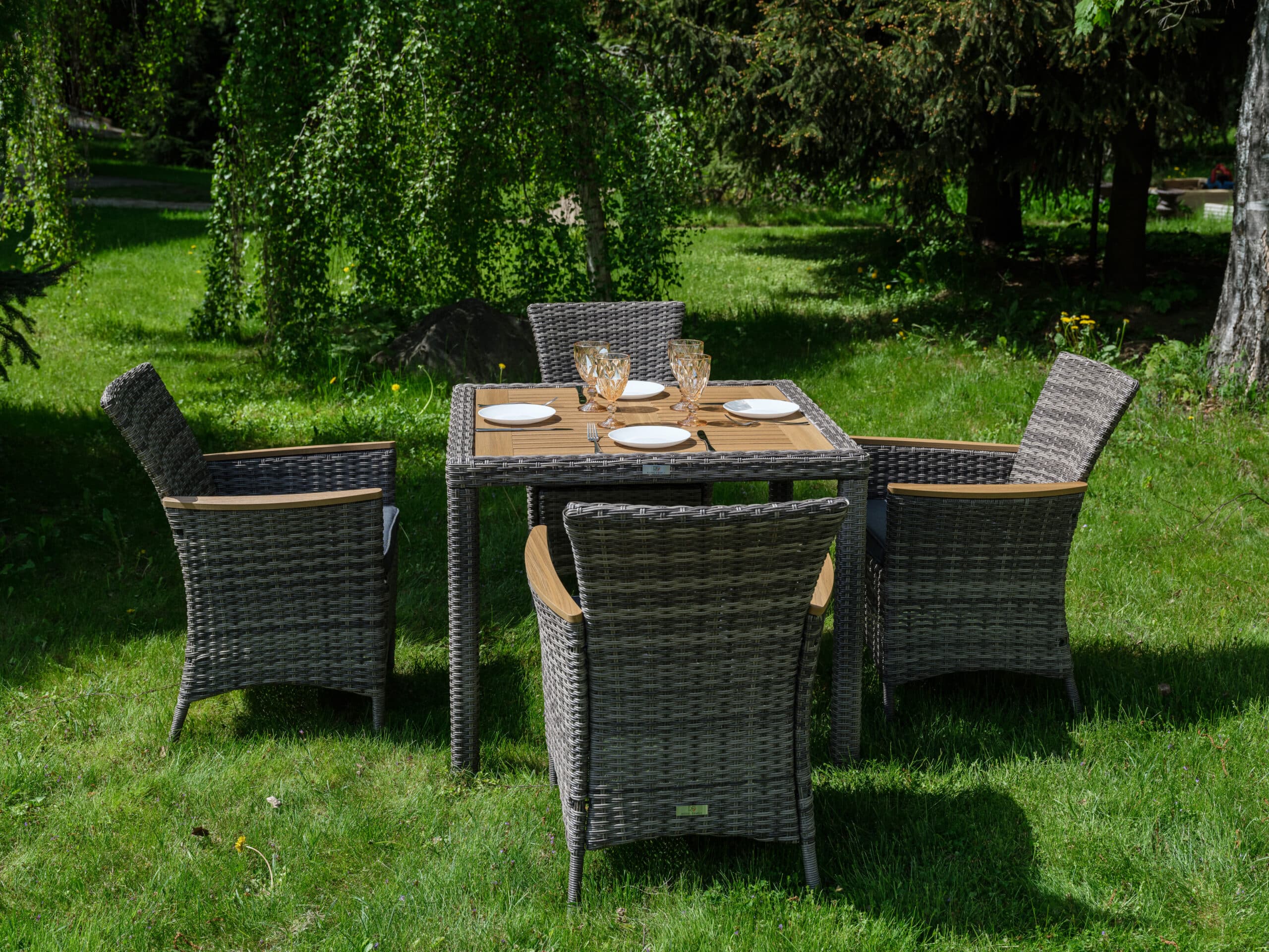 Комплект дополняет квадратный стол с элегантной столешницей, идеально подходящий для четырех человек.