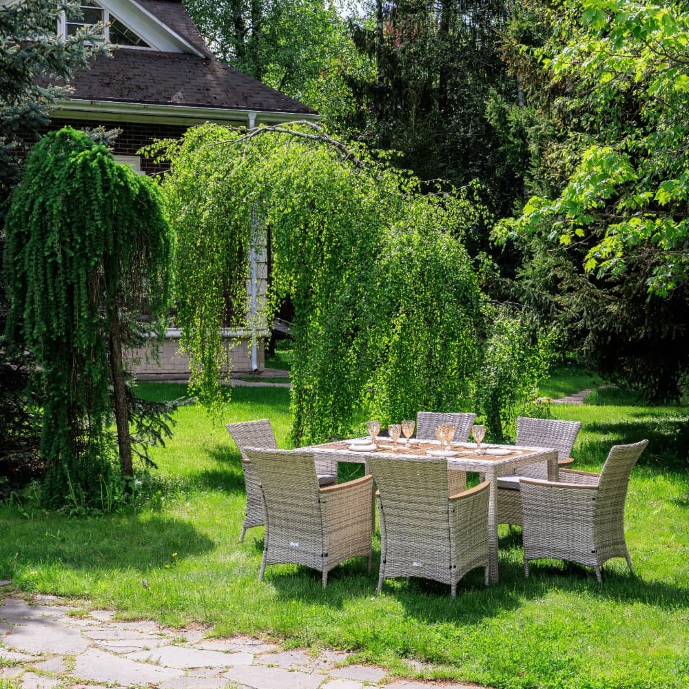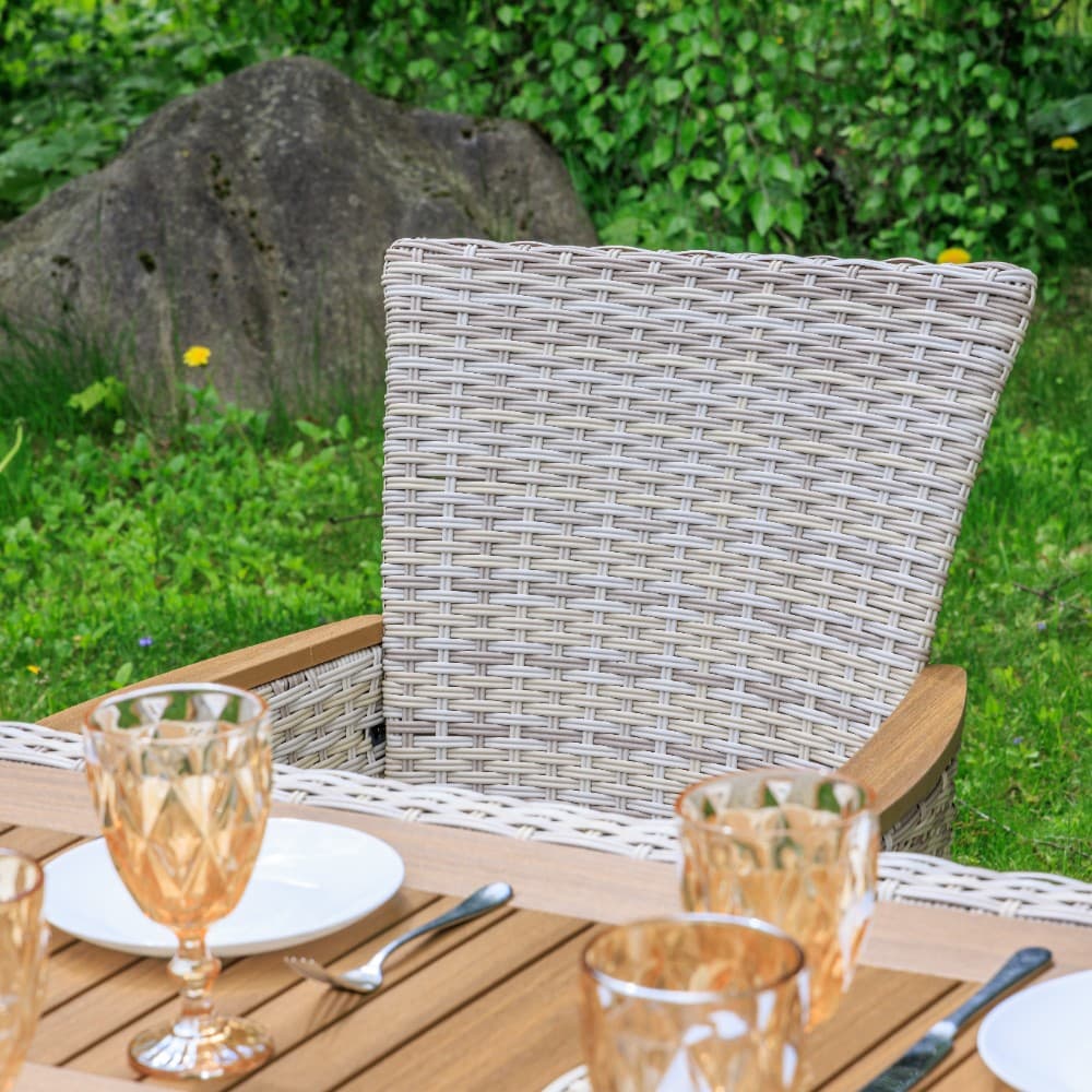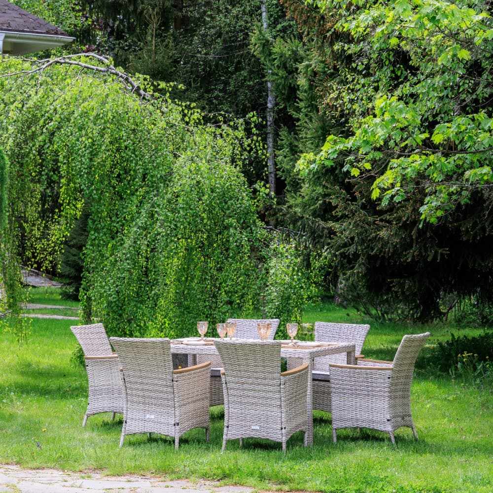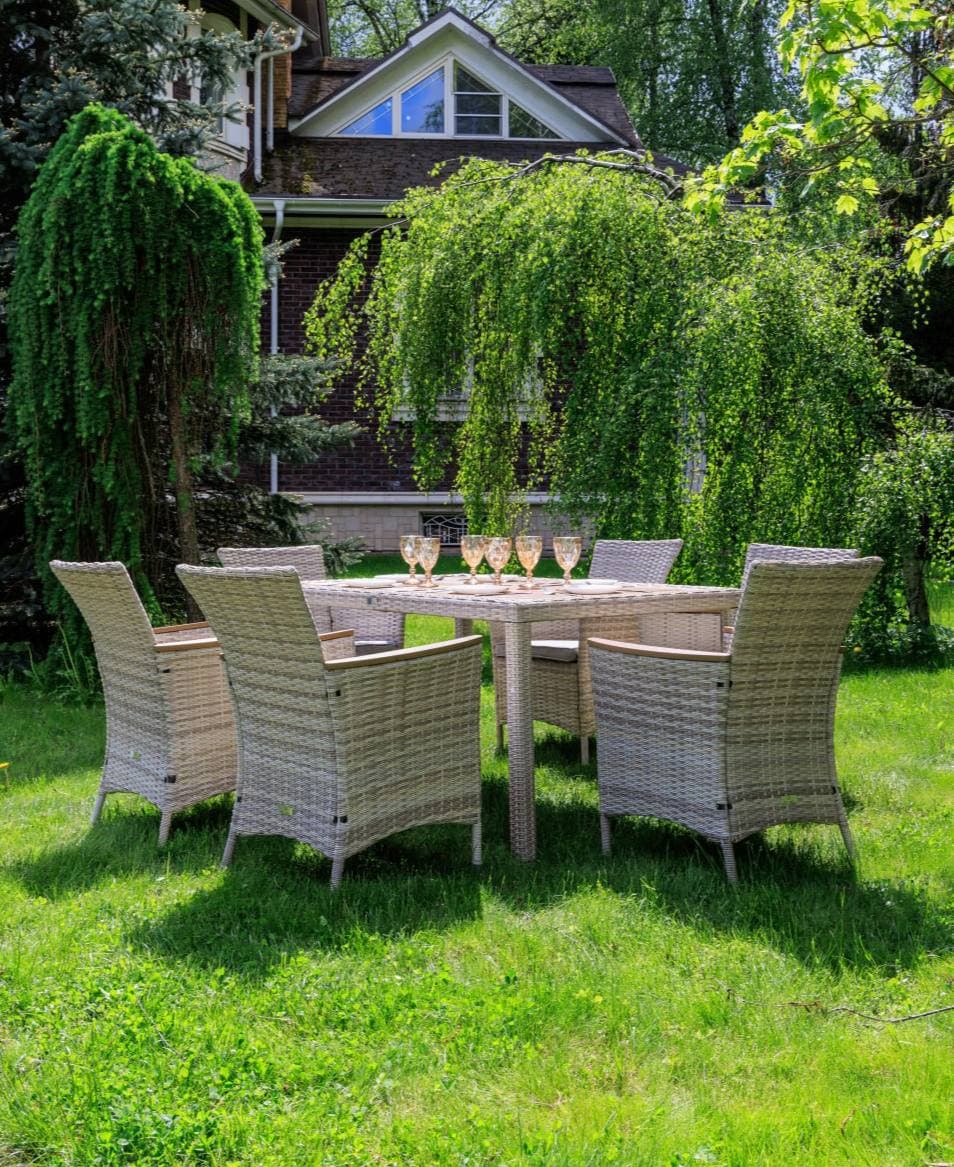 Включает в себя шесть кресел из искусственного ротанга на стальном каркасе и прочный стол.