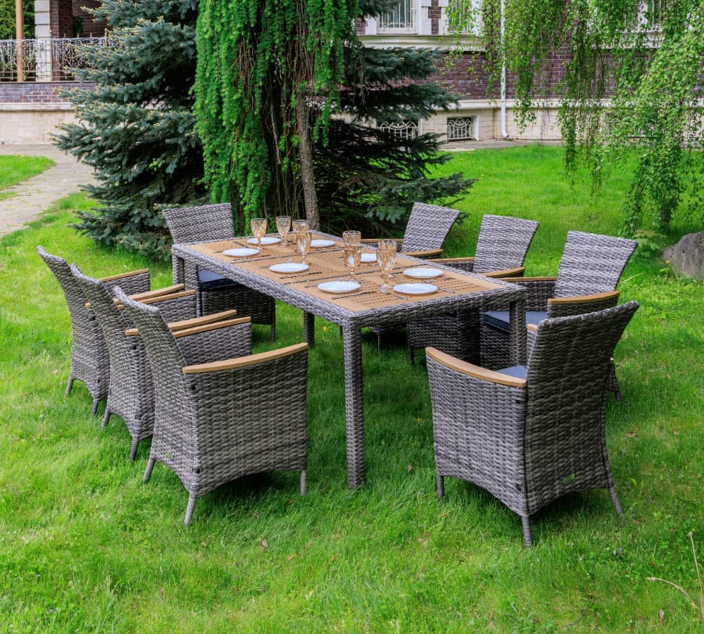 Включает в себя восемь кресел из искусственного ротанга на стальном каркасе и прочный стол.